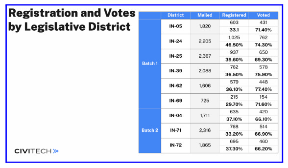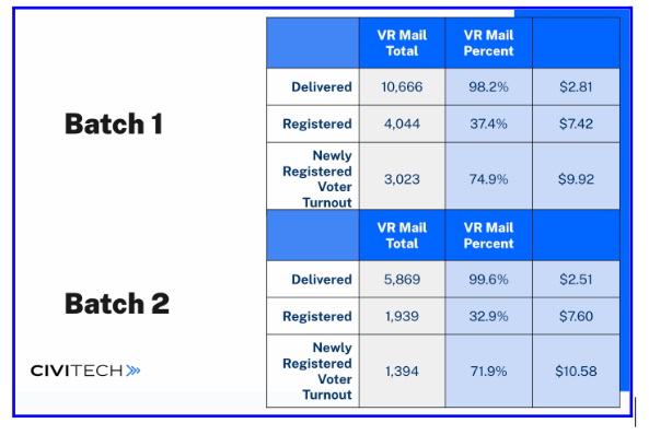 ✅ Moved 74.9% of newly registered voters to the polls from Batch One and moved 71.9% of new registered voters to the polls from Batch Two.